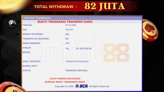 TOGEL88 mengucapkan selamat kepada user id : WAF*** yang telah berhasil mendapatkan jackpot pada permainan LIVE CASINO DI DRAGON TIGER. Kemenangan sebesar Rp 82.000.000,-. telah dibayarkan LUNAS oleh pihak TOGEL88 kepada pemilik user id setelah yang bersangkutan mengisi formulir withdraw. Proses pencairan dana berlangsung sangat cepat hanya dalam waktu 5-10 menit sudah berada dalam rekening pemilik user id. Bukti transfer yang dapat anda lihat adalah bukti SAH / VALID yang langsung di dapatkan melalui bukti transaksi dari Bank yang digunakan untuk pengiriman dana pada rekening pemilik user id. Terima kasih kami sampaikan kepada para pengguna setia TOGEL88 yang telah menggunakan situs kami, sebagai Bandar Terpercaya yang pastinya membayar semua kemenangan member hingga lunas. Apakah TOGEL88 PENIPU ? Reputasi “TOGEL88 TERPERCAYA” sudah sangat melekat. puluhan hingga ratusan ribu pengguna setia TOGEL88 tetap menggunakan situs terbesar dan terbaik di Indonesia ini. Hapus rasa was-was dan khawatir anda, kemenangan anda berapapun PASTI dibayarkan hingga lunas.