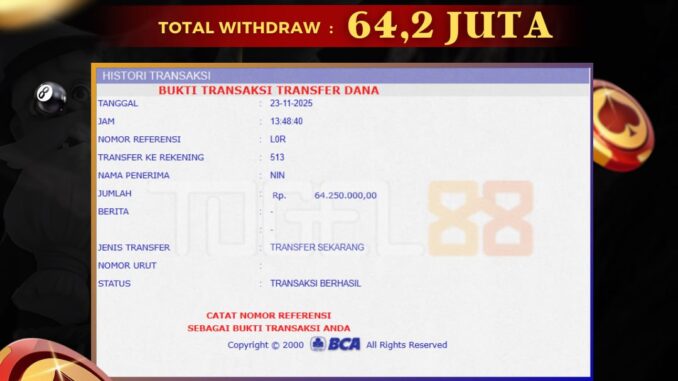 TOGEL88 mengucapkan selamat kepada user id : NIN*** yang telah berhasil mendapatkan jackpot pada permainan LIVE CASINO DI DRAGON TIGER. Kemenangan sebesar Rp 64.200.000,-. telah dibayarkan LUNAS oleh pihak TOGEL88 kepada pemilik user id setelah yang bersangkutan mengisi formulir withdraw. Proses pencairan dana berlangsung sangat cepat hanya dalam waktu 5-10 menit sudah berada dalam rekening pemilik user id. Bukti transfer yang dapat anda lihat adalah bukti SAH / VALID yang langsung di dapatkan melalui bukti transaksi dari Bank yang digunakan untuk pengiriman dana pada rekening pemilik user id. Terima kasih kami sampaikan kepada para pengguna setia TOGEL88 yang telah menggunakan situs kami, sebagai Bandar Terpercaya yang pastinya membayar semua kemenangan member hingga lunas. Apakah TOGEL88 PENIPU ? Reputasi “TOGEL88 TERPERCAYA” sudah sangat melekat. puluhan hingga ratusan ribu pengguna setia TOGEL88 tetap menggunakan situs terbesar dan terbaik di Indonesia ini. Hapus rasa was-was dan khawatir anda, kemenangan anda berapapun PASTI dibayarkan hingga lunas.