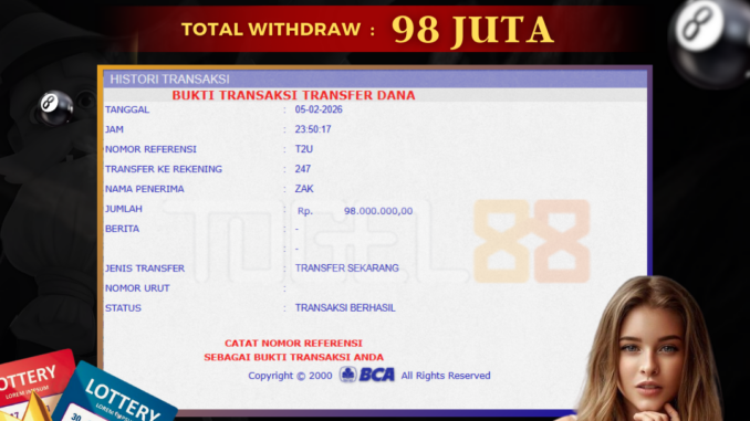 TOGEL88 mengucapkan selamat kepada user id : HAN*** yang telah berhasil mendapatkan jackpot pada permainan TOGEL DI HONGKONG LOTTO. Kemenangan sebesar Rp 98.000.000,-. telah dibayarkan LUNAS oleh pihak TOGEL88 kepada pemilik user id setelah yang bersangkutan mengisi formulir withdraw. Proses pencairan dana berlangsung sangat cepat hanya dalam waktu 5-10 menit sudah berada dalam rekening pemilik user id. Bukti transfer yang dapat anda lihat adalah bukti SAH / VALID yang langsung di dapatkan melalui bukti transaksi dari Bank yang digunakan untuk pengiriman dana pada rekening pemilik user id. Terima kasih kami sampaikan kepada para pengguna setia TOGEL88 yang telah menggunakan situs kami, sebagai Bandar Terpercaya yang pastinya membayar semua kemenangan member hingga lunas. Apakah TOGEL88 PENIPU ? Reputasi “TOGEL88 TERPERCAYA” sudah sangat melekat. puluhan hingga ratusan ribu pengguna setia TOGEL88 tetap menggunakan situs terbesar dan terbaik di Indonesia ini. Hapus rasa was-was dan khawatir anda, kemenangan anda berapapun PASTI dibayarkan hingga lunas.