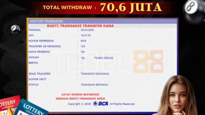 TOGEL88 mengucapkan selamat kepada user id : CIN*** yang telah berhasil mendapatkan jackpot pada permainan TOGEL DI TOTOMACAU 4D. Kemenangan sebesar Rp 70.600.000,-. telah dibayarkan LUNAS oleh pihak TOGEL88 kepada pemilik user id setelah yang bersangkutan mengisi formulir withdraw. Proses pencairan dana berlangsung sangat cepat hanya dalam waktu 5-10 menit sudah berada dalam rekening pemilik user id. Bukti transfer yang dapat anda lihat adalah bukti SAH / VALID yang langsung di dapatkan melalui bukti transaksi dari Bank yang digunakan untuk pengiriman dana pada rekening pemilik user id. Terima kasih kami sampaikan kepada para pengguna setia TOGEL88 yang telah menggunakan situs kami, sebagai Bandar Terpercaya yang pastinya membayar semua kemenangan member hingga lunas. Apakah TOGEL88 PENIPU ? Reputasi “TOGEL88 TERPERCAYA” sudah sangat melekat. puluhan hingga ratusan ribu pengguna setia TOGEL88 tetap menggunakan situs terbesar dan terbaik di Indonesia ini. Hapus rasa was-was dan khawatir anda, kemenangan anda berapapun PASTI dibayarkan hingga lunas.